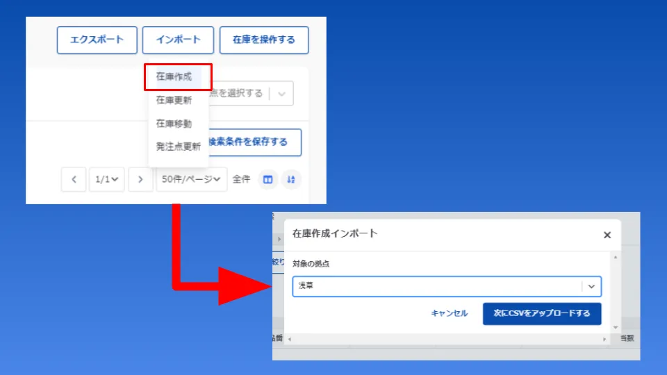 在庫作成を選択在庫を作成する拠点を選択 > 「次にCSVアップロードする」をクリック