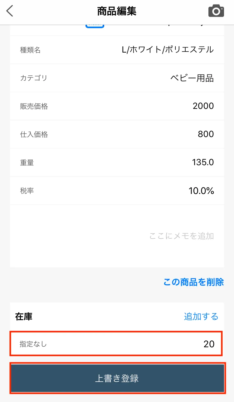 登録すると商品編集ページの戻るので、上書き登録をタップして完了です。