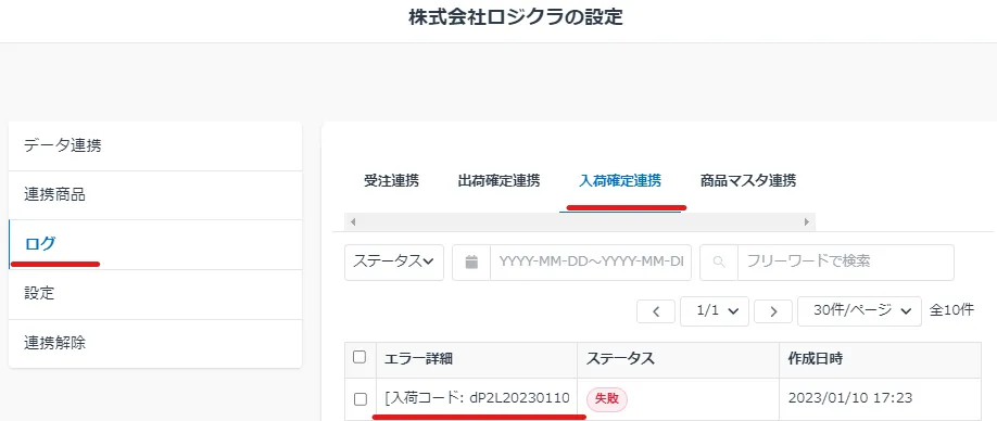 ロジクラ連携設定にて「入荷時に入荷確定処理をする」にチェックがあること
