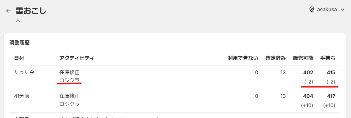 Shopify調整履歴には在庫調整:ロジクラと表示され、出荷した数量がマイナスされていることを確認します。