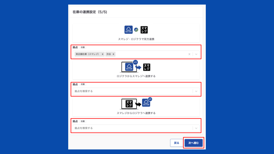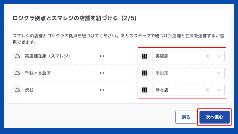在庫連携をする拠点を紐づけて「次へ進む」をクリック