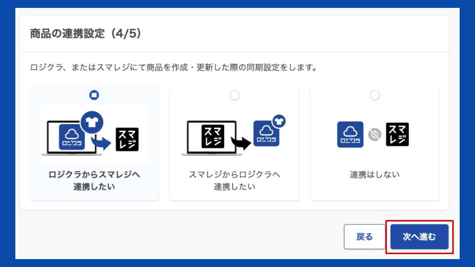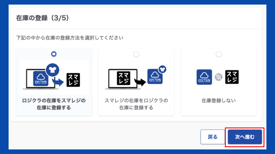 拠点ごとに在庫連携をする方法を選択して「次へ進む」をクリック