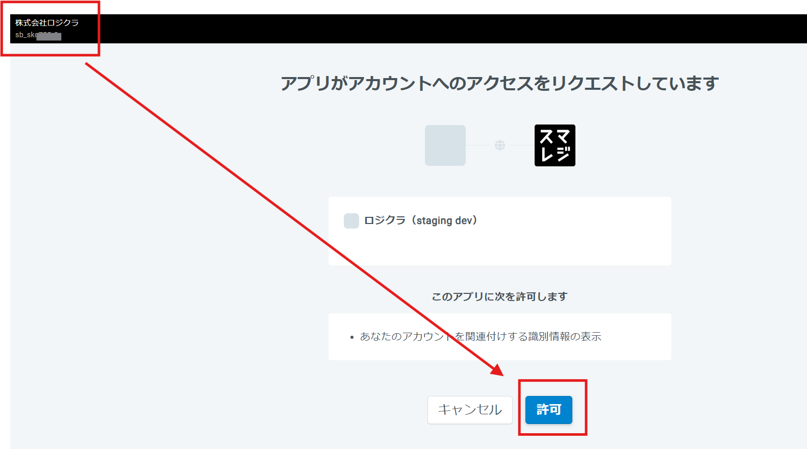 左上のスマレジアカウントIDをご確認いただき、問題なければ「許可」をクリックします。