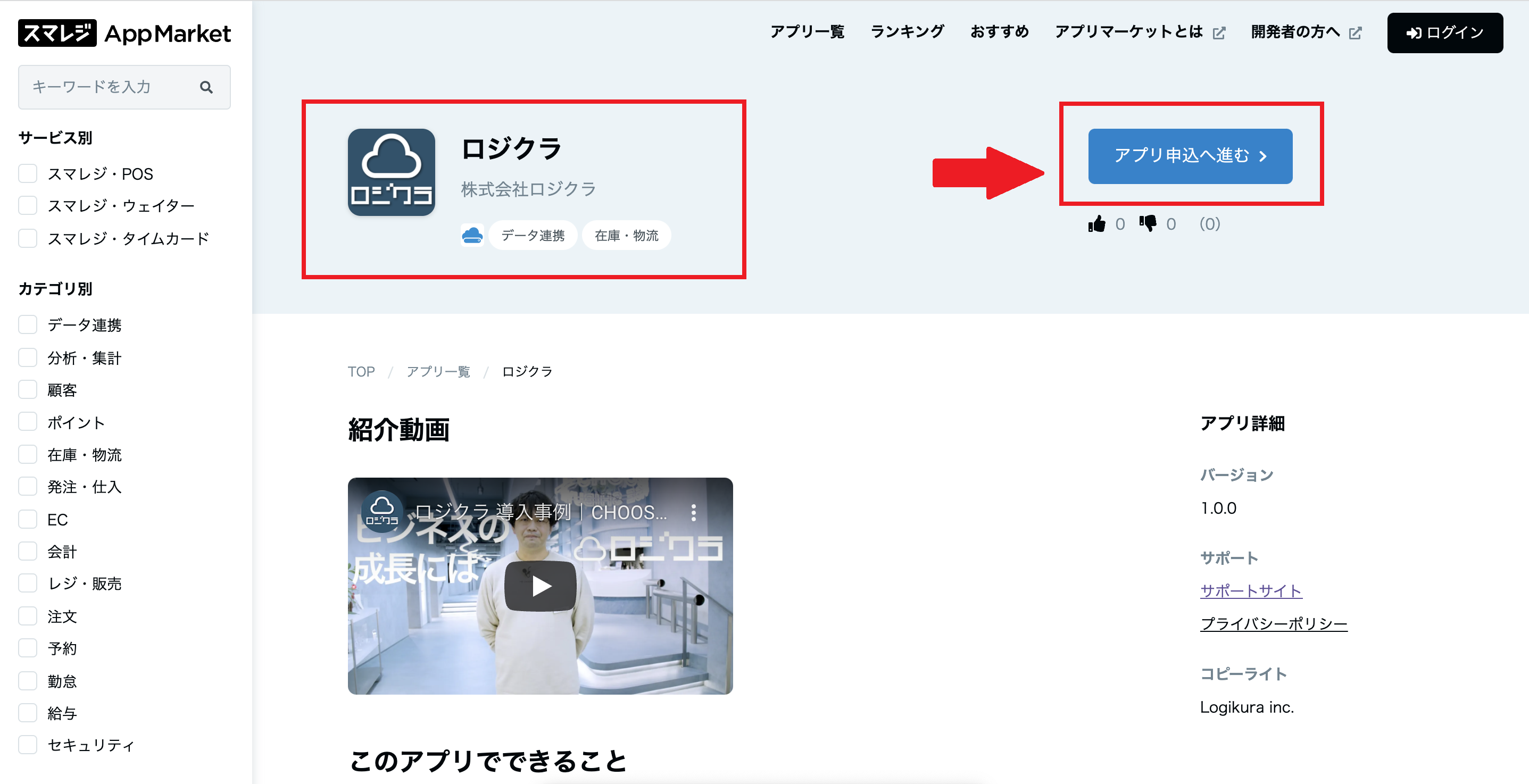 スマレジアプリマーケットから”ロジクラ”と検索します