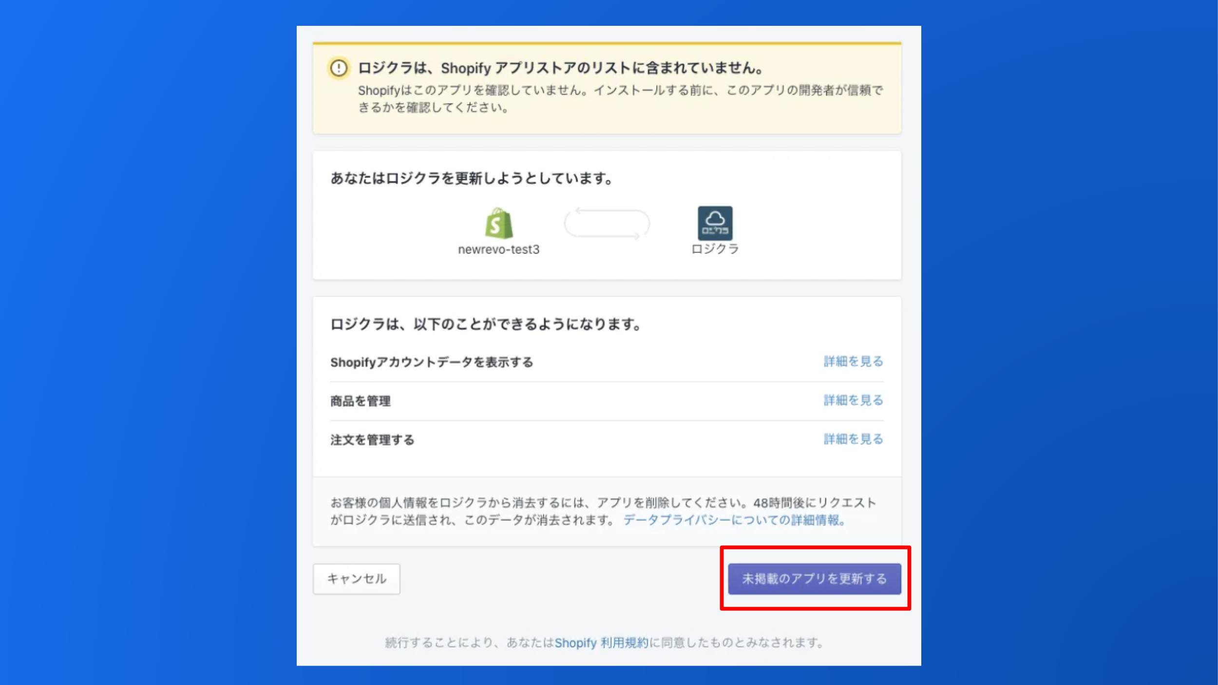 再連携の場合、Shopifyの画面に遷移後「データアクセスの更新」画面が表示されますので、「更新」をクリックして進んでください。
