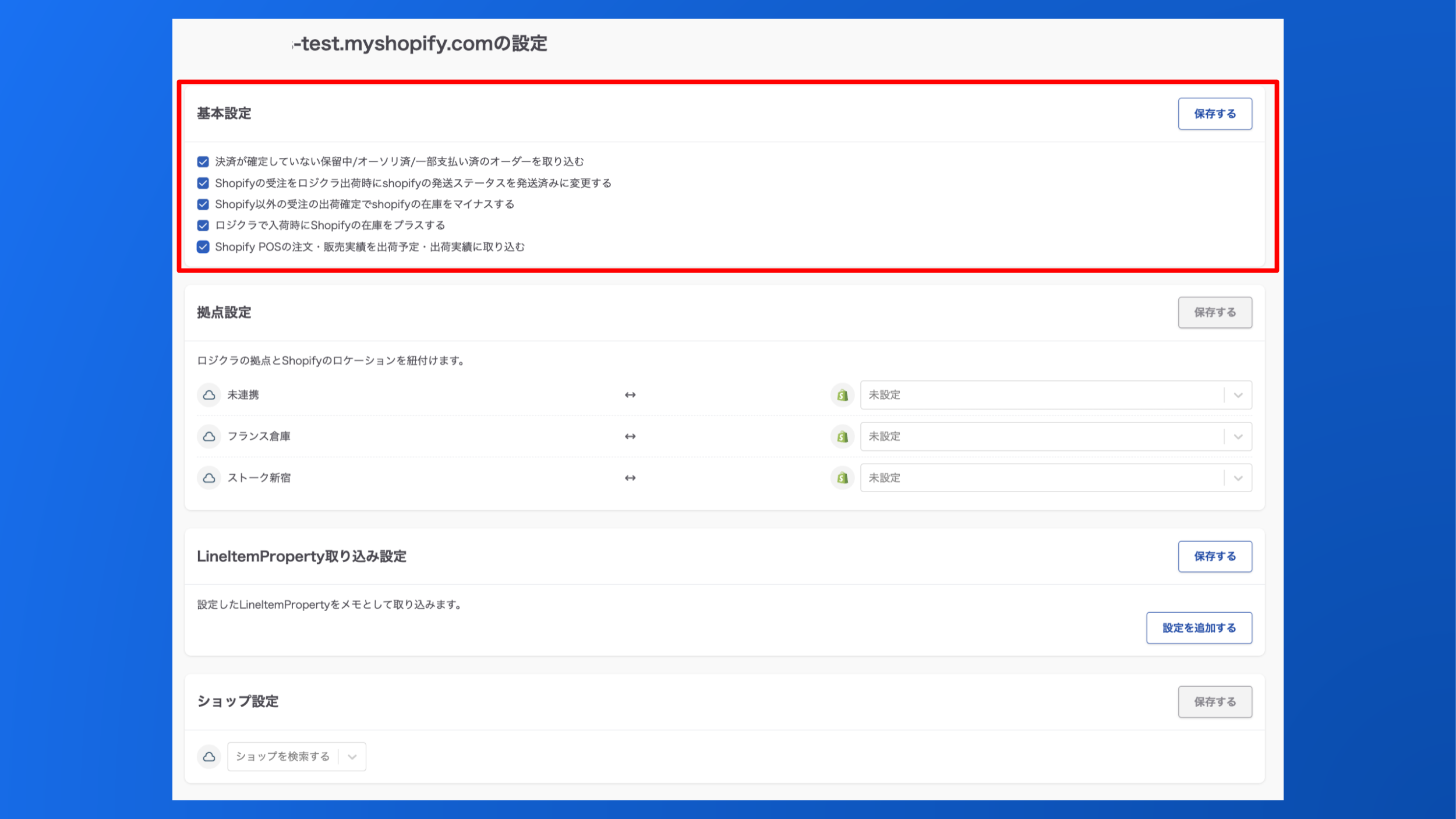 各ストアごとに連携が必要ですので、ロジクラと連携するストア全てで実施ください。