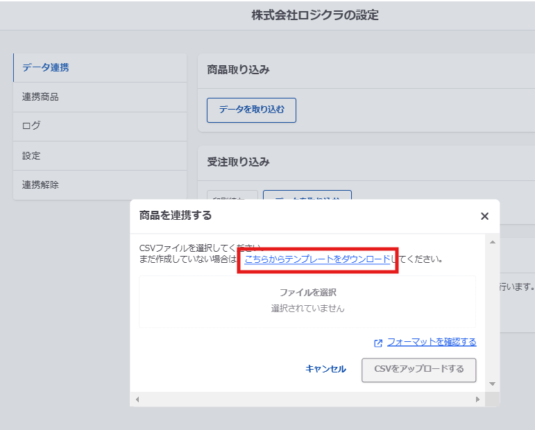 ⑤ CSV商品連携のアップロード画面からCSVをインポート