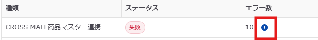 エラーが出た場合、ステータスが「失敗」となります。エラー数の隣にあるアイコンからエラー内容を確認してください。
