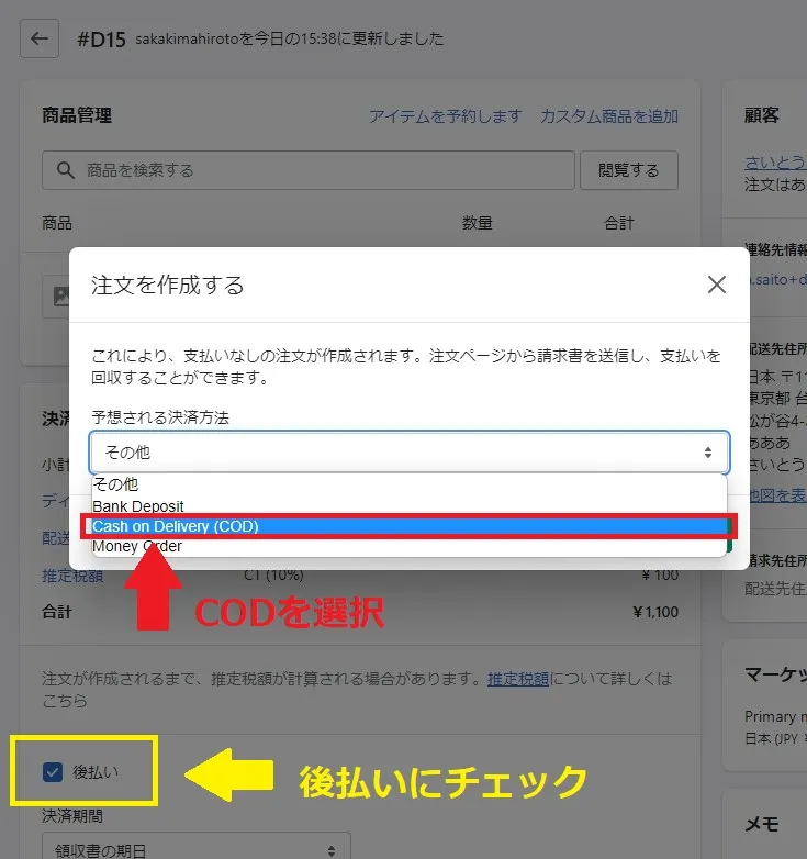 Shopify管理画面から「支払い済みとしてマーク」>「受け取った決済のタイプ」を「Cash on Delivery(COD)」とした注文