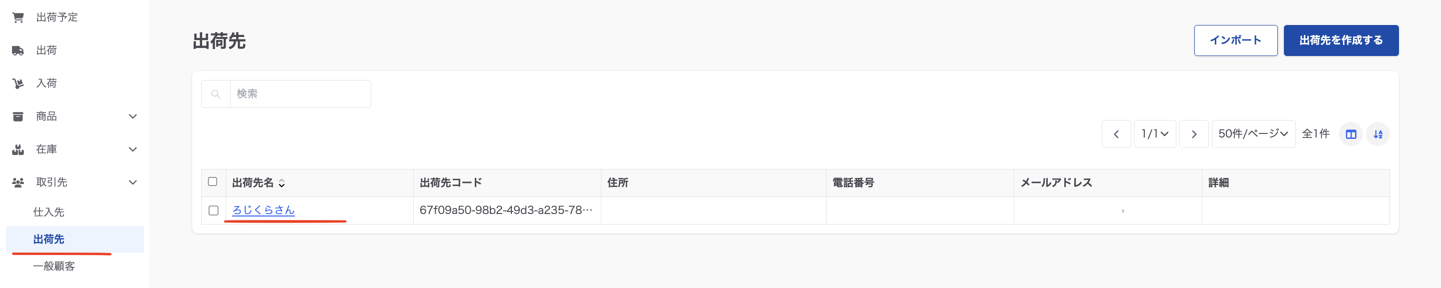 左側メニューバーの「取引先」から「出荷先」を選択し、今後出荷先として残したい出荷先名をクリック(画像例では「ろじくらさん」)