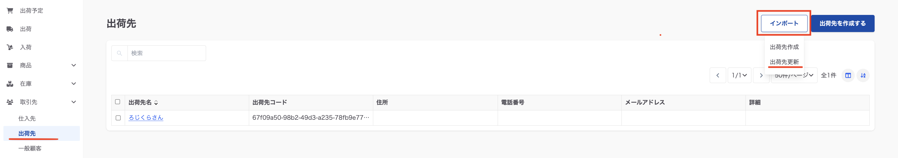 左側メニューバーの「取引先」から「出荷先」を選択し、「インポート」から「出荷先更新」をクリック