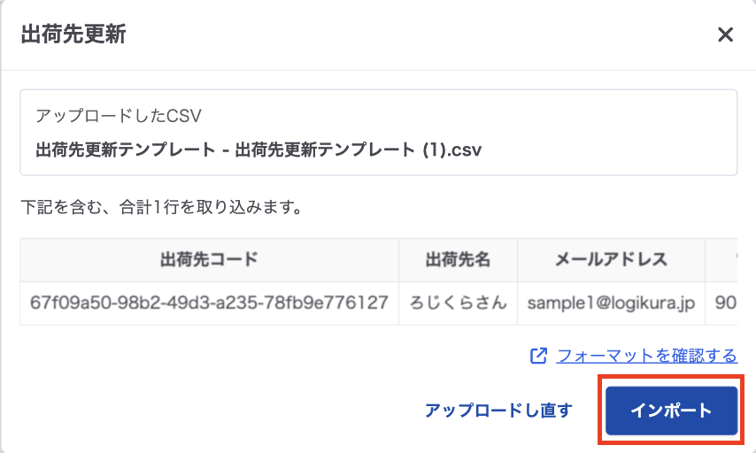アップロード内容を確認し「インポート」をクリック