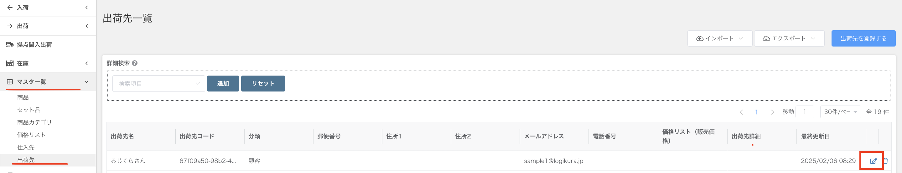 左側メニューバーの「マスタ一覧」から「出荷先」を選択し、今後出荷先として残したい出荷先の編集マーク(画像右端)をクリック