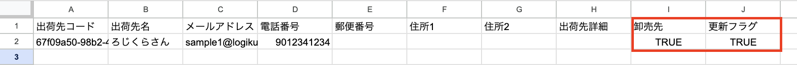 卸売先として登録する取引先情報の項目をすべて入力し、「卸売先」と「更新フラグ」の列にTRUEと入力