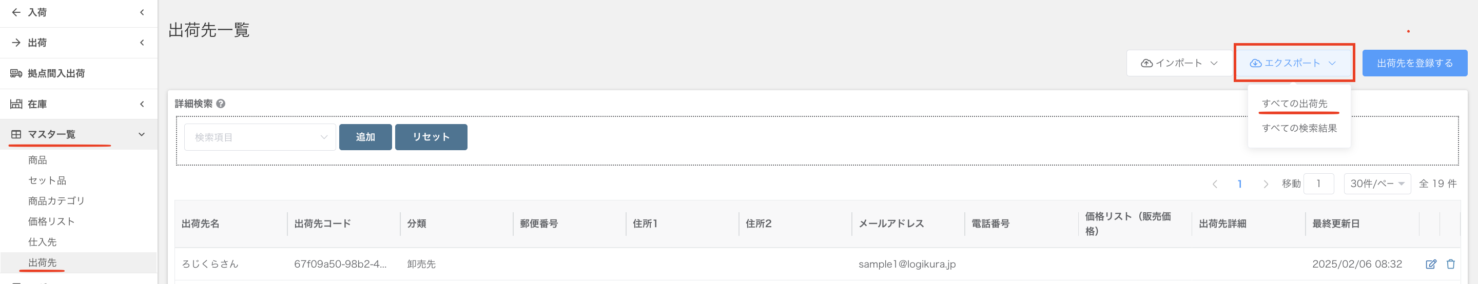 左側メニューバーの「マスタ一覧」から「出荷先」を選択し、「エクスポート」から「すべての出荷先」をクリック