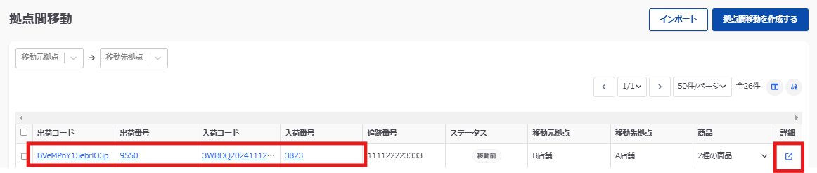 メニュー> 在庫> 拠点間移動より、ステータスが移動前の拠点間移動のデータをクリックします。