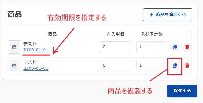 1つの商品に対し2種類の有効期限の在庫を入荷してみましょう