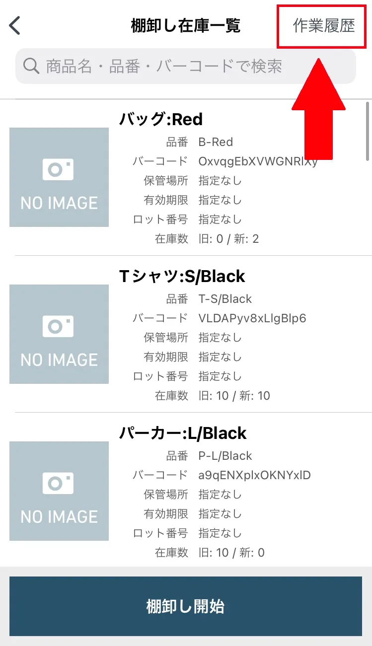 1. 棚卸し一覧より「作業履歴」をタップし、該当の商品を探しタップします。