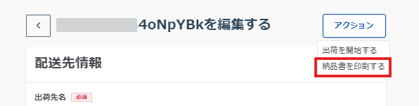 各出荷情報の編集画面を開き「アクション」から「納品書を印刷する」をクリックします。