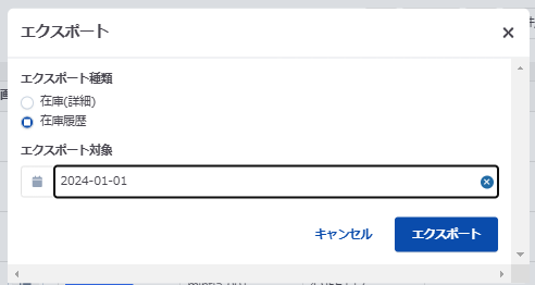 エクスポート種類を「在庫履歴」とし、確認したい日付を選択し、エクスポートボタンをクリックします。