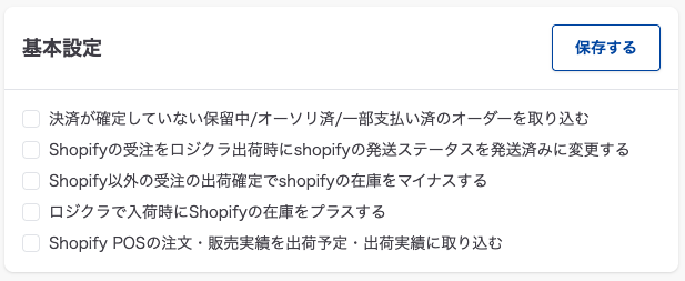 ShopifyPOSとロジクラを連携する場合はチェックを入れた状態にします。