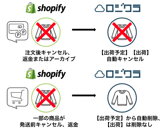 商品の編集と同じ扱いになります。キャンセル・返金された一部商品がロジクラの出荷予定から削除されますが、出荷のステータスにある場合は削除されません。ロジクラの出荷状況を必ず確認してください。