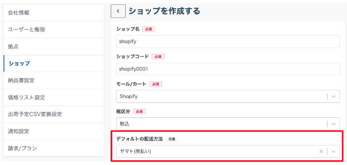 Shopify連携にて、代金引換(COD: Cash on Delivery)の注文をロジクラに受注連携した際、ロジクラのショップ設定で設定した「デフォルト配送方法」に基づき、配送方法、配送指定の一部項目が自動登録されます。