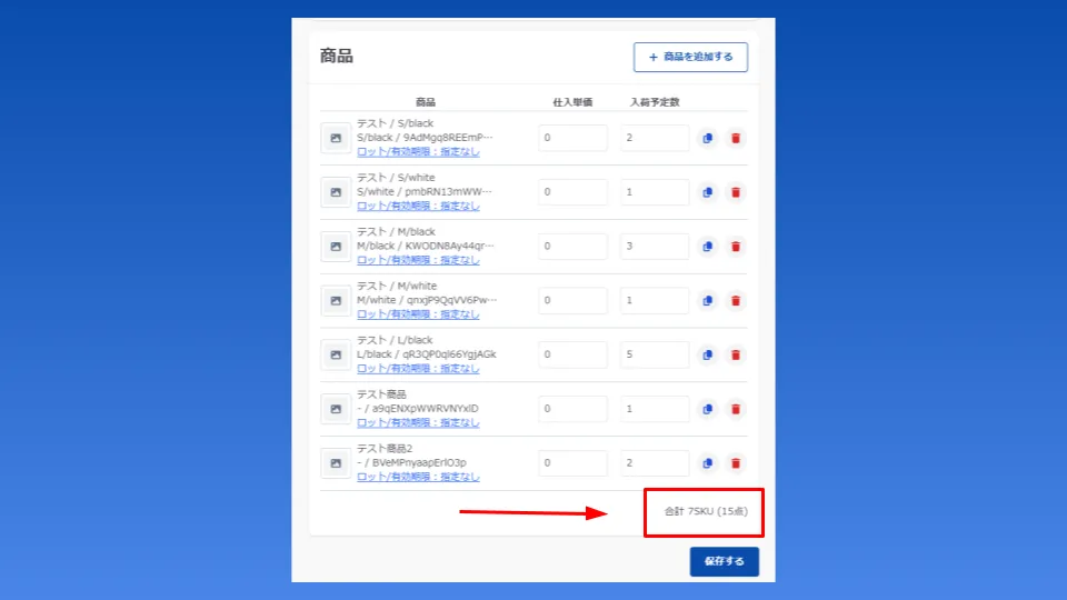 入荷や出荷を作成・編集する際に商品の種類数と、合計点数を確認したいというお声をいただき、画面下部に合計SKU数と合計点数を表示しました。