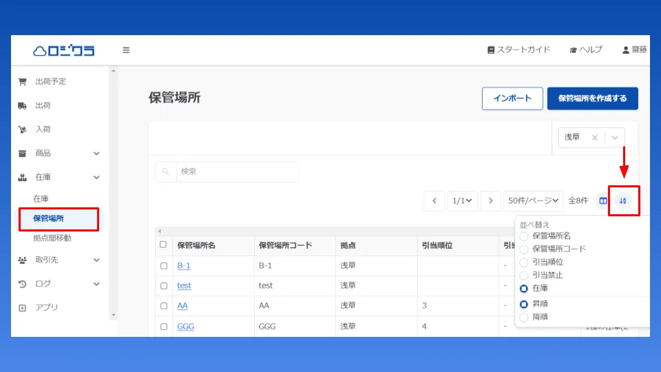 メニュー 在庫> 保管場所から、各保管場所にある在庫数での並び替えに対応いたしました。並び替えを「在庫」「昇順」にしますと、在庫の登録がない保管場所が先頭に表示され、続いて在庫数が0の保管場所、続いて在庫数が1以上の保管場所と並んで表示されます。