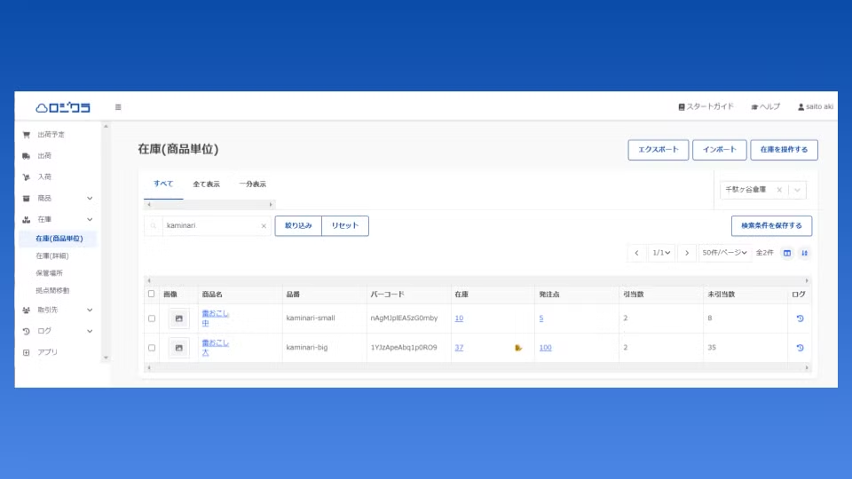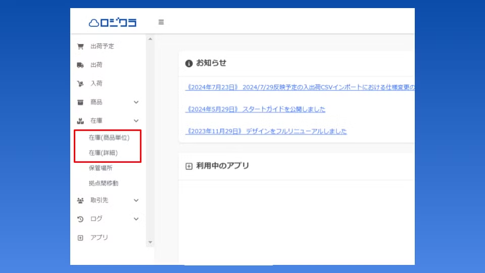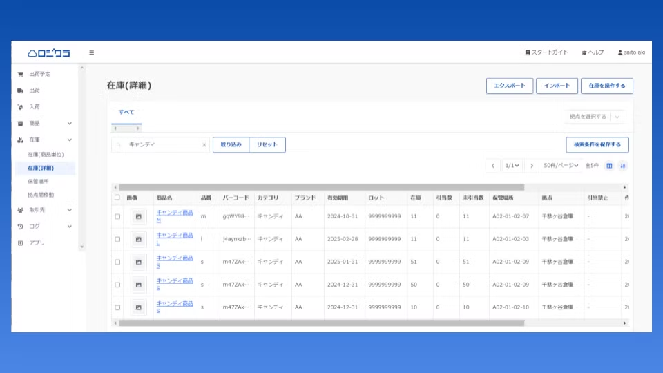 ロジクラの新しいデザインにおきまして、有効期限・保管場所・ロット番号のある在庫に関して、全商品を一覧で確認したいというお声をいただき、在庫詳細を確認できる一覧メニューを追加いたします。