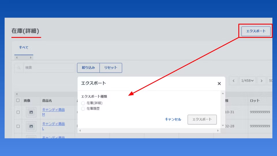 従来は”在庫”のエクスポート種類が4つありましたが、変更後は各一覧画面から適切なデータをエクスポート可能になります。