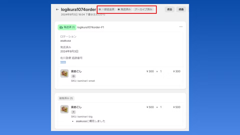 Shopifyで商品Bを返金処理する。→Shopifyの注文ステータスが発送済みになる
