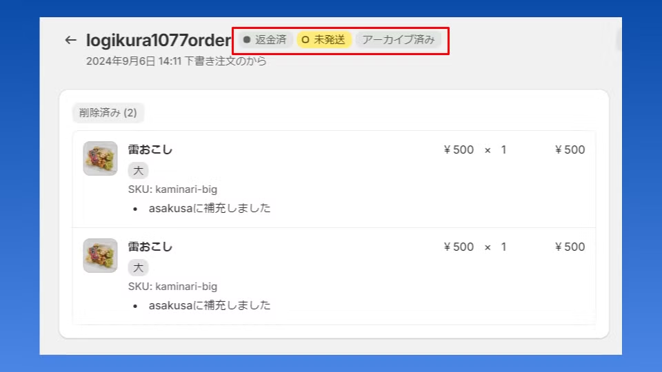 ShopifyでAを返金処理する。 →Shopifyの注文が未発送の状態でアーカイブされる