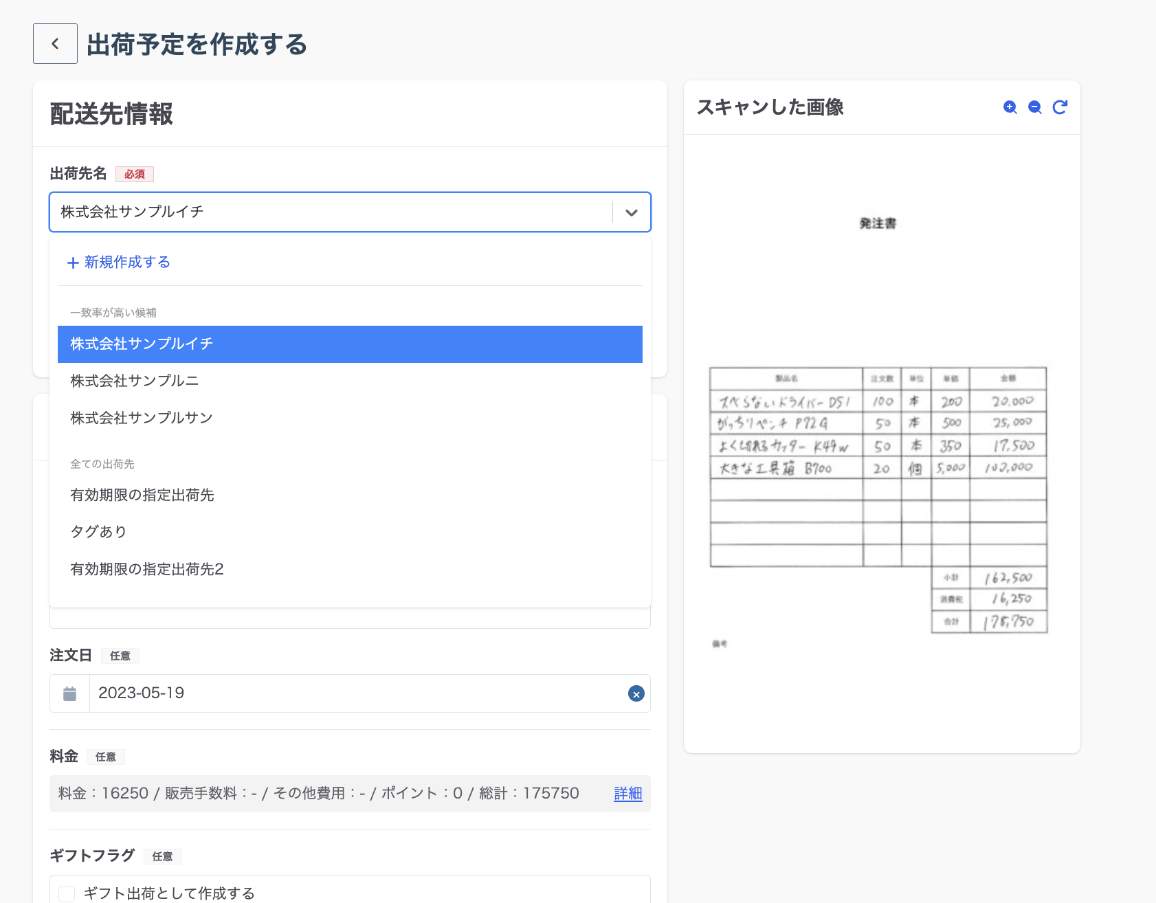 画像から自動生成されたデータをもとに 下書き出荷予定 を作成