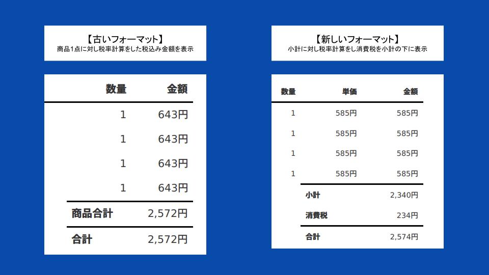 古いのフォーマット:商品ごとに消費税額を算出・加算し、消費税合計を算出