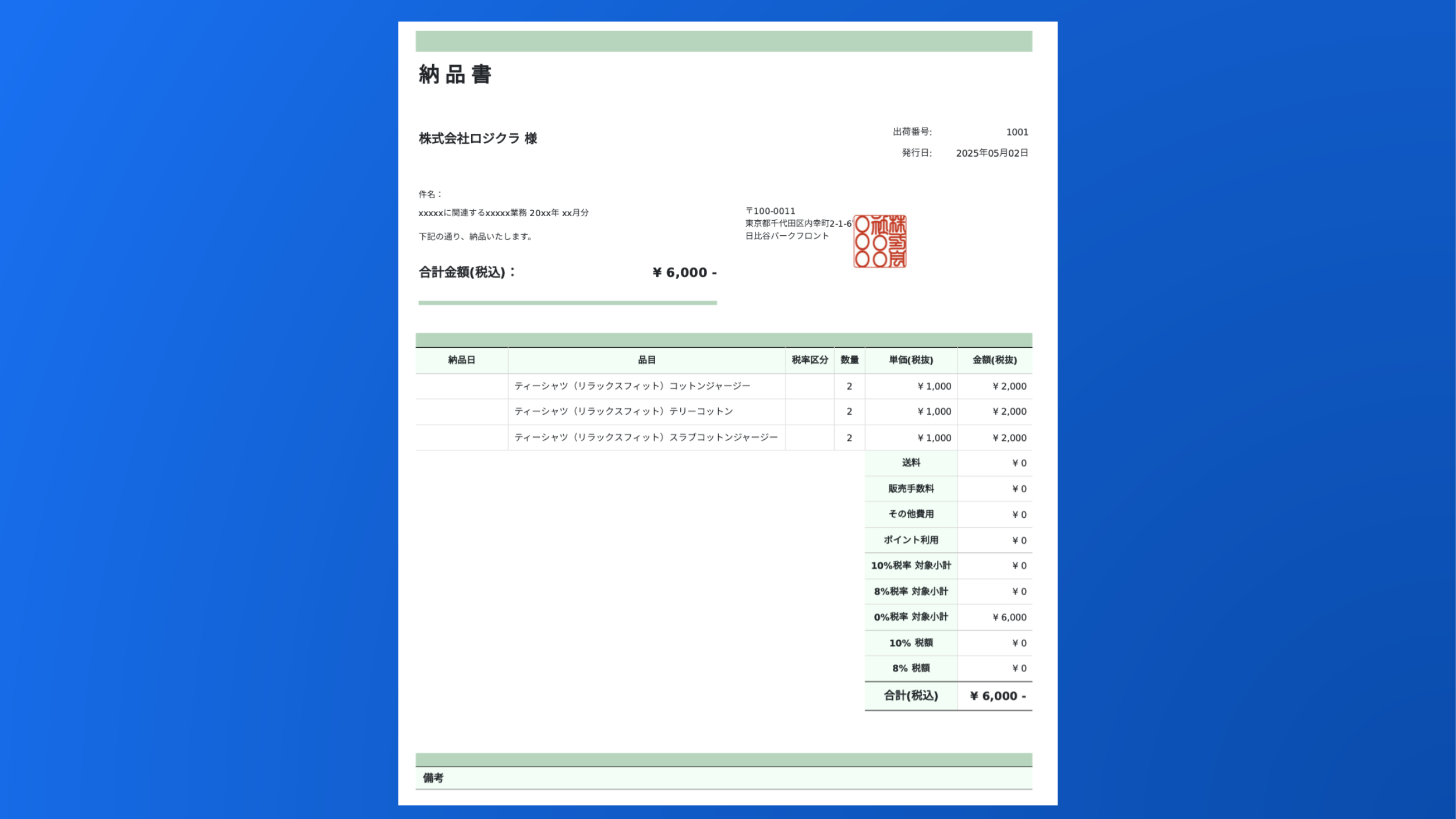 見出し | 変更なし | 「納品書」「請求書」などのタイトルを入力します |