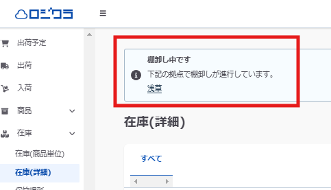 4. 在庫(詳細)一覧に戻るので、画面を更新すると画面上部に棚卸し中ですと表示がされたら棚卸表の作成が完了