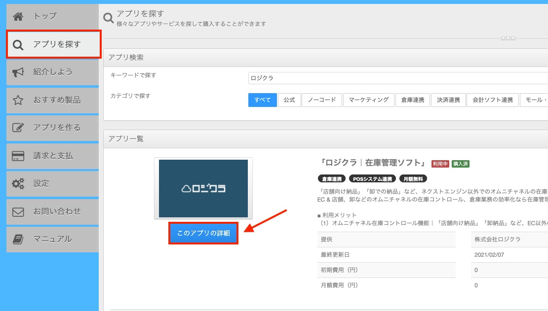 「アプリを探す」からロジクラを検索し「このアプリの詳細」を選択します。