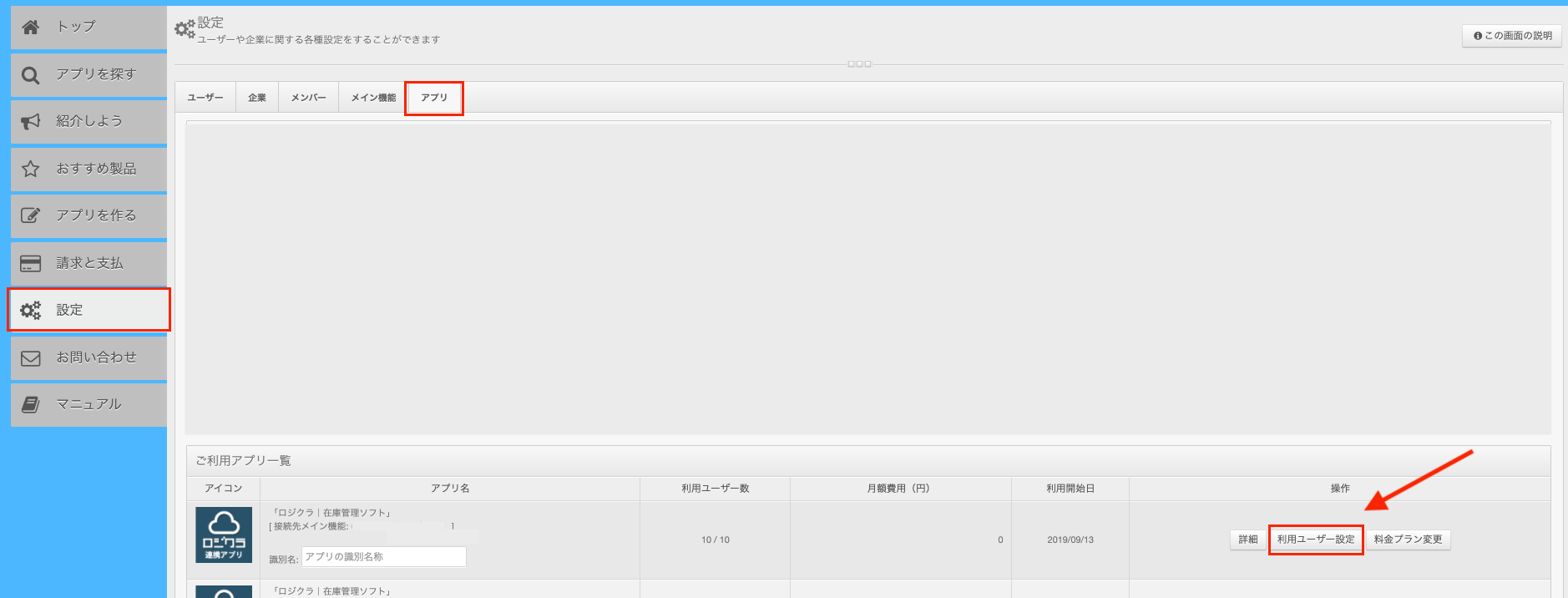 設定 > アプリ > ご利用アプリ一覧 > ロジクラアプリの利用ユーザー設定 を開きます。