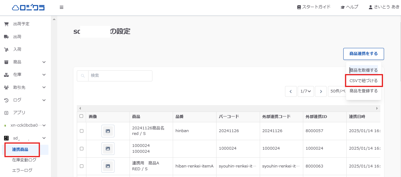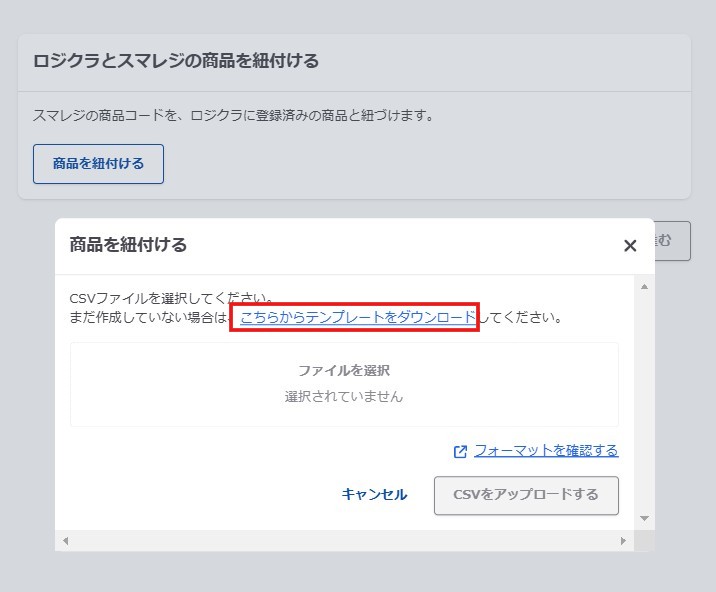 連携商品から「商品連携をする」より「CSVで紐づける」を選択