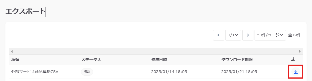エクスポート画面が開き、ステータスが成功になったら右側のダウンロードアイコンをクリックしてCSVをダウンロード