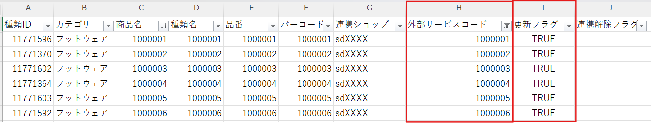 CSVの「外部サービスコード」の列にスマレジの商品コードを入力、「更新フラグ」の列に「TRUE」を入力してCSVを保存