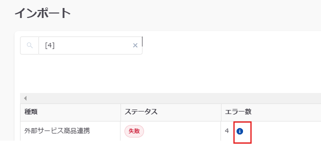 ログ>インポートから確認できます。インポートの種類は「外部サービス商品連携」ステータスは「失敗」または「成功」のログが残ります。