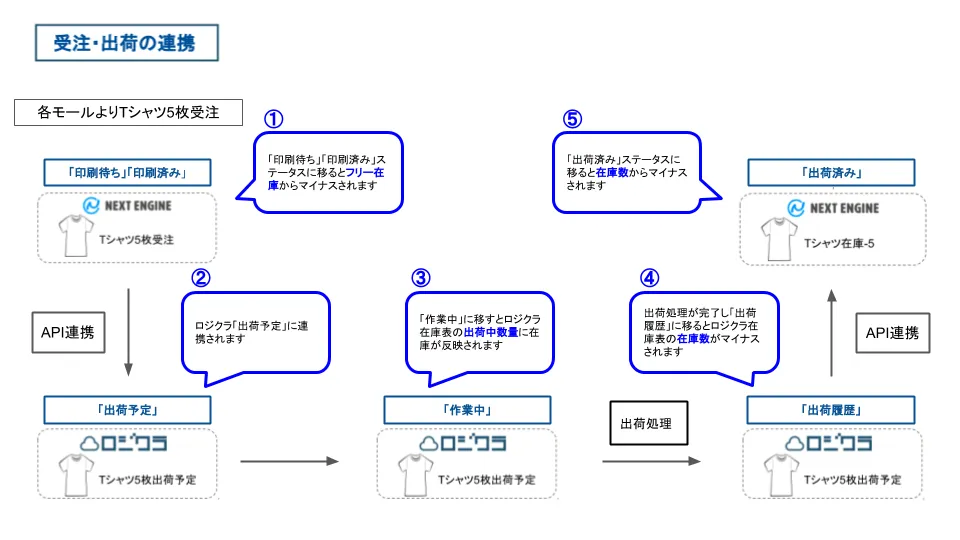 ロジクラで出荷処理をした出荷予定がAPIでネクストエンジンの受注伝票に自動連携され、ネクストエンジン受注伝票が「出荷済み」ステータスに移行し、在庫数がマイナスされます。