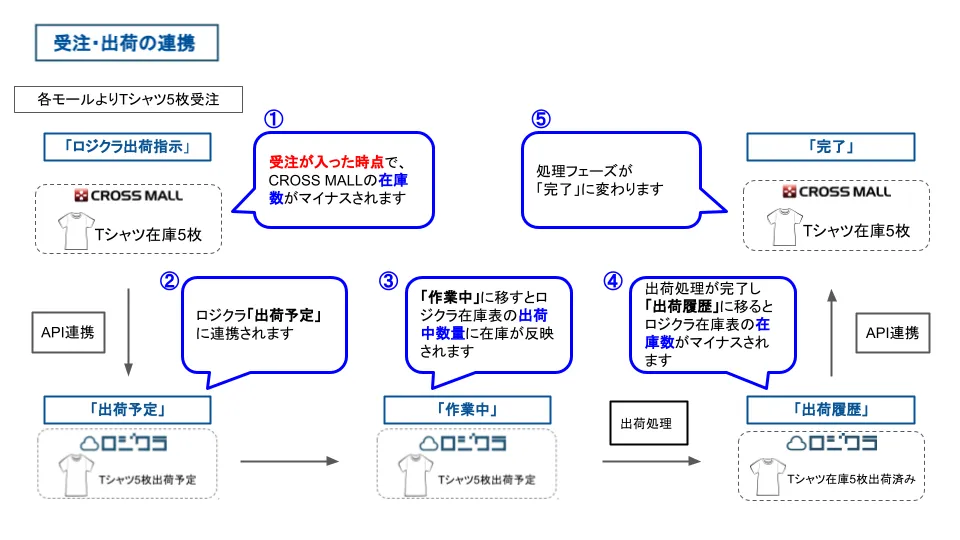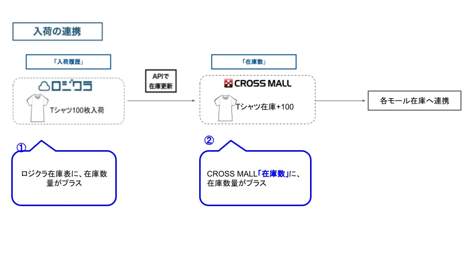 ①の入荷数がロジクラからCROSS MALLにAPIで自動連携され、CROSS MALLの在庫数量が加算されます。