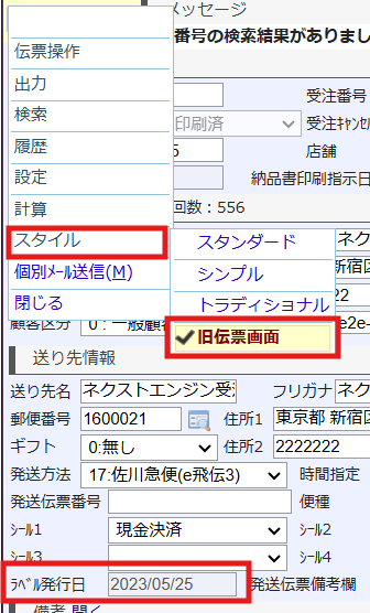 • 「ラベル発行日」は受注伝票のスタイルを旧伝票画面にすると確認できます。