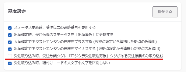 • 受注分類タグ「ロジクラ受注取込対象」を取り込む設定をしている場合、