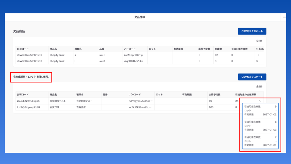 欠品が起きた場合、「有効期限・ロット割れを防止」が設定されている対象は通常の欠品情報とは別で表示されます。