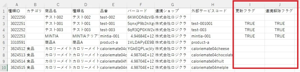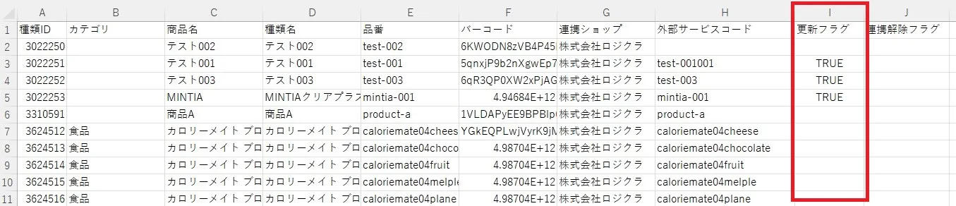 誤って登録したH列の「外部サービスコード」を正しい商品コードに書き換え、I列の更新フラグに「TRUE」と入力します。