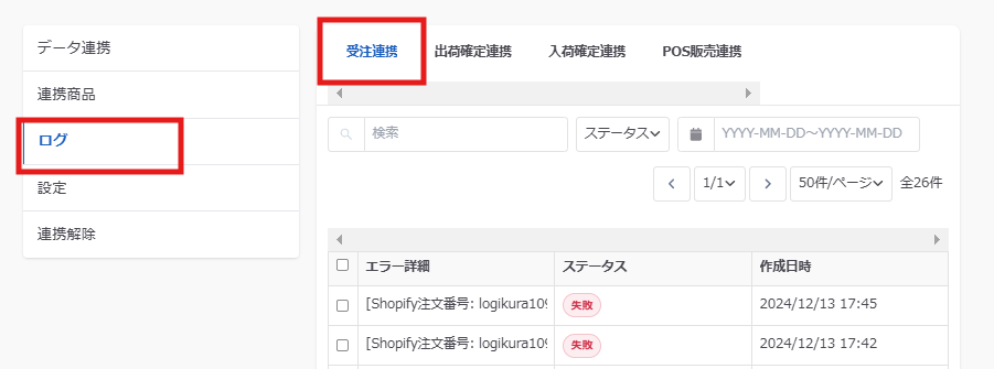 Shopify連携設定のログから受注連携のタブを確認します。